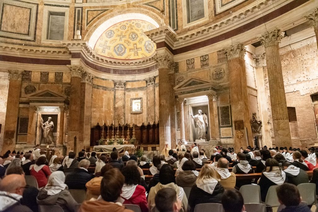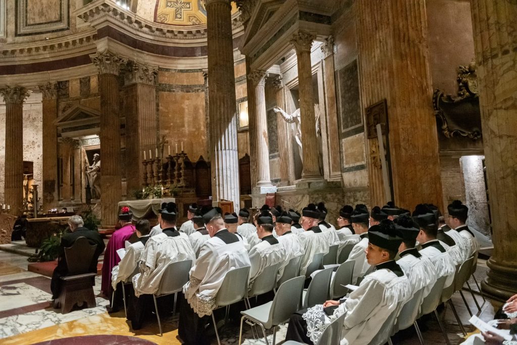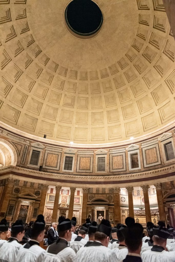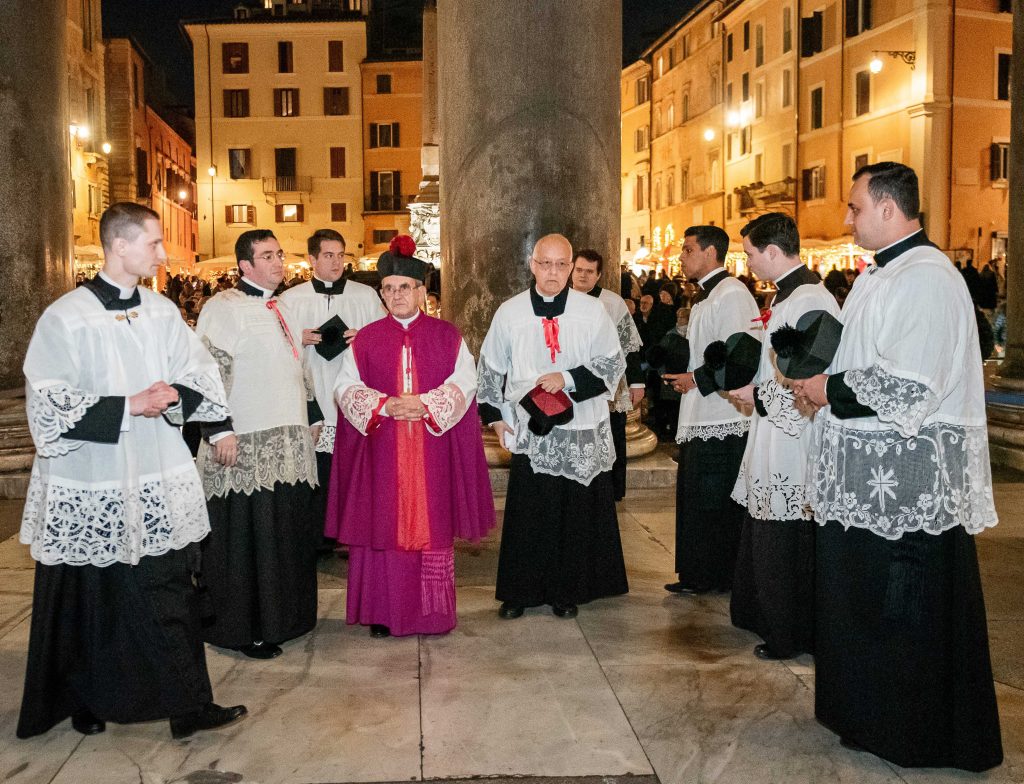 Giovedì 11, nella splendida Basilica Collegiata di Santa Maria ad Martyres (Pantheon), il Reverendissimo Maestro Mons. Valentino Miserachs Grau, Canonico di Santa Maria Maggiore e dunque Protonotario soprannumerario, ha pontificato i Vespri nella festa di San Damaso. La Cappella Musicale del Pantheon, diretta dal Maestro Loda, ha curato l’accompagnamento musicale di questa celebrazione nel programma del quale erano annoverate anche splendide polifonie composte dal medesimo officiante. Un momento di rara bellezza liturgica e musicale che ha dato il la a questo grande pellegrinaggio romano. Oltre al clero dell’Istituto anche diversi monsignori e sacerdoti amici hanno assistito coralmente alla funzione.