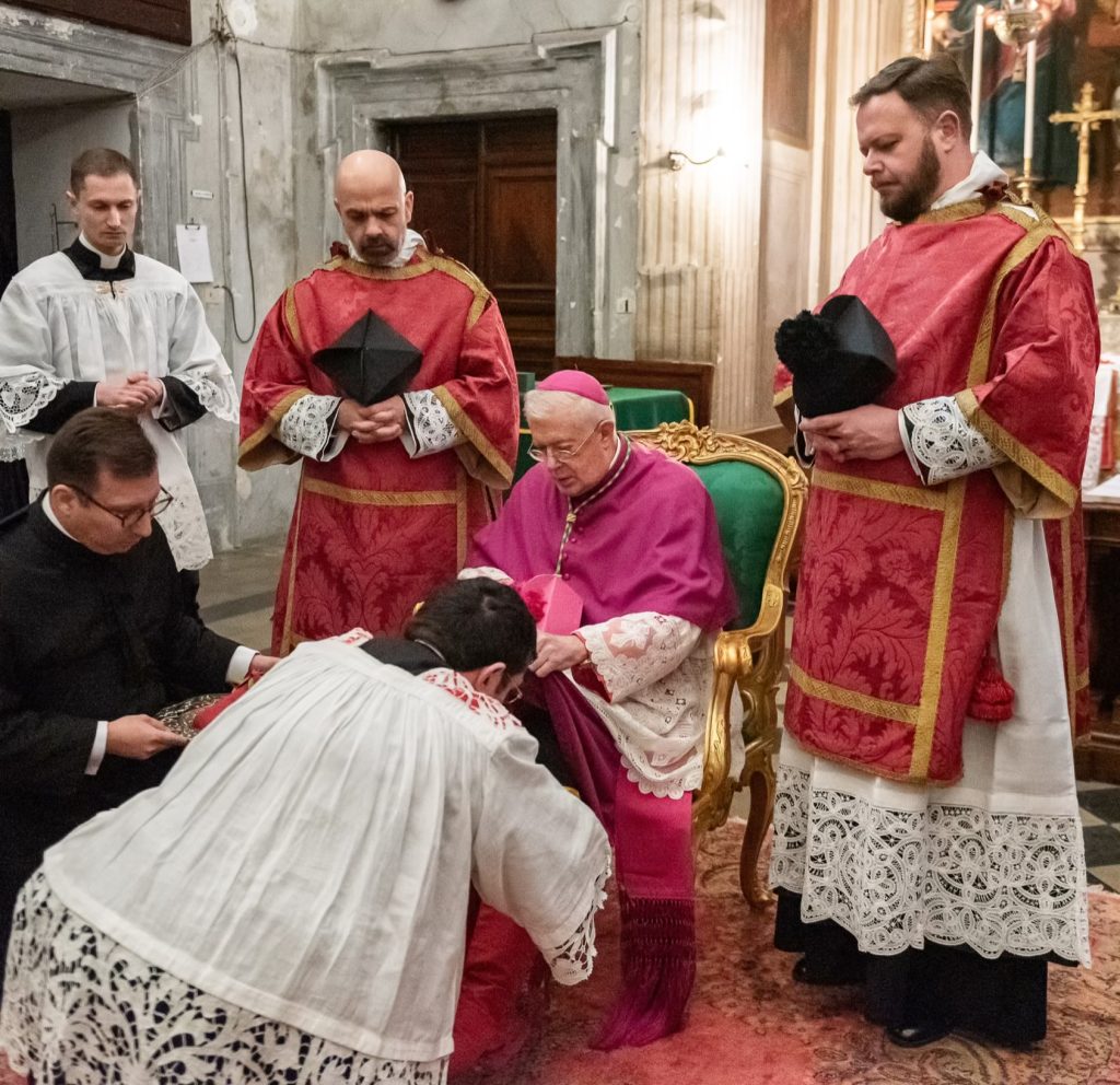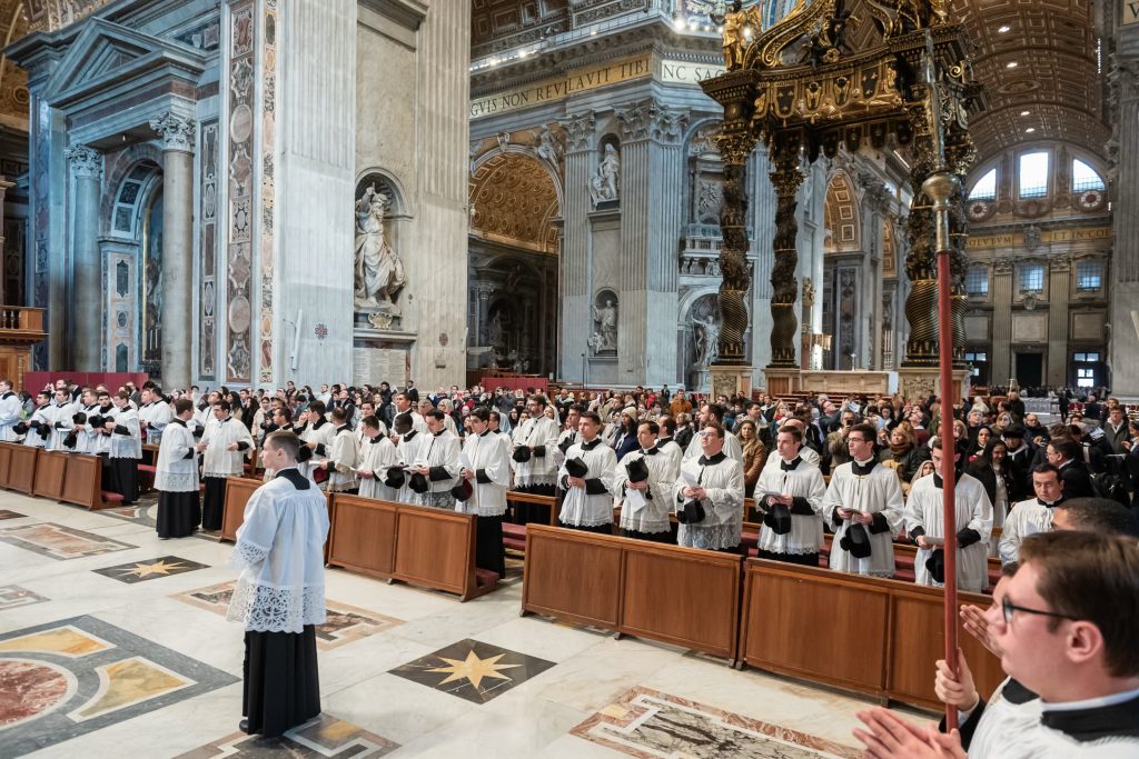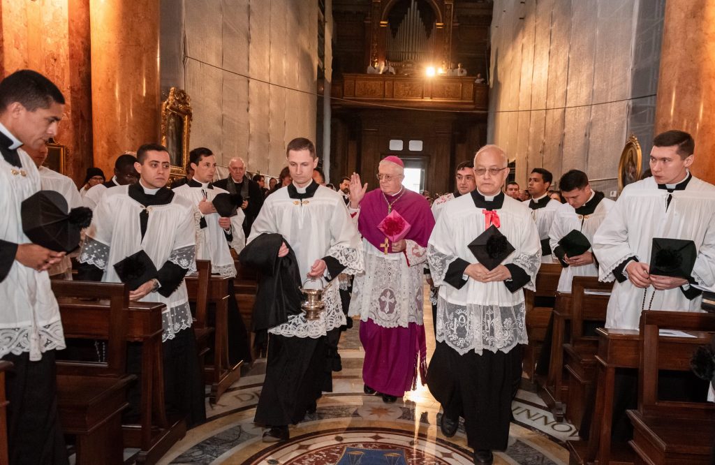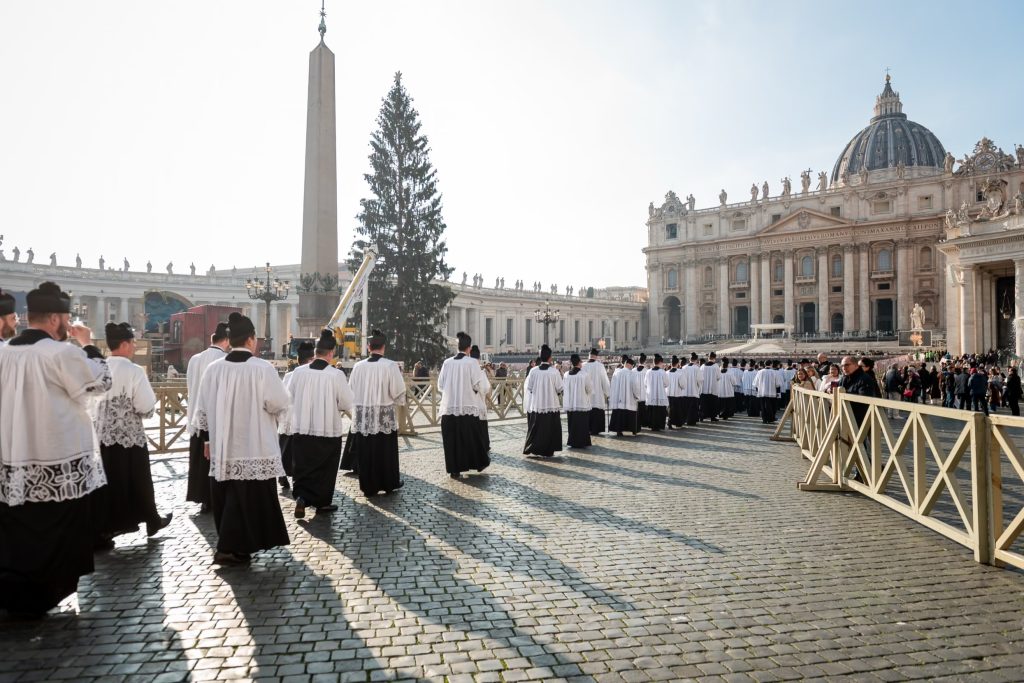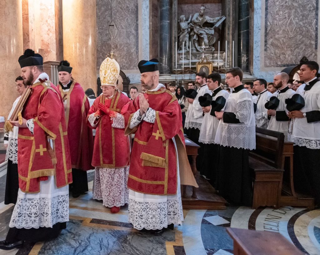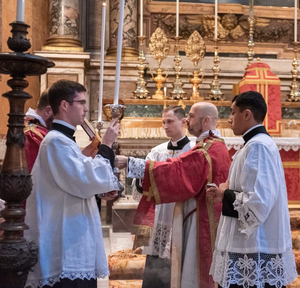 Sabato 13, nella festa di Santa Lucia Vergine e Martire, Sua Eccellenza Reverendissima Mons. Pozzo, Arcivescovo Titolare di Bagnoregio, ha pontificato la Santa Messa al faldistorio presso la Santissima Trinità dei Pellegrini in cui siamo stati accolti amichevolmente dalla Fraternità Sacerdotale San Pietro. In questa occasione, non solo i seminaristi, ma anche diversi sacerdoti si sono prestati al coro eseguendo il gregoriano ma soprattutto le splendide polifonie che fanno ormai parte del ventennale repertorio dell’Istituto. Terminata la Santa Messa ed elevato un Te Deum alla Provvidenza Divina che non cessa di concedere grazie, apostolati e vocazioni alla nostra giovane comunità, il pellegrinaggio si è snodato in processione attraversando solennemente il centro storico grazie alla grande disponibilità delle autorità civili. Sotto gli occhi degli esercenti, dei turisti e dei romani affacciati alle finestre la lunga processione,al canto di inni latini e cantici in differenti lingue nazionali, ha raggiunto dapprima Castel Sant’ Angelo e poi Via della Conciliazione all’inizio della quale ci attendevano i volontari del Giubileo che incaricati dal Dicastero competente hanno operato per un acceso rapido, solenne e devoto in Piazza San Pietro. La processione attraversava dunque la Porta Santa al canto delle litanie dei santi guidata dai superiori maggiori della nostra società di vita apostolica di diritto pontificio. Incredibile ed indescrivibile la gioia e lo stupore dei pellegrini venuti dai continenti più lontani e che vedevano per la prima volta la chiesa simbolo di tutta la cristianità.