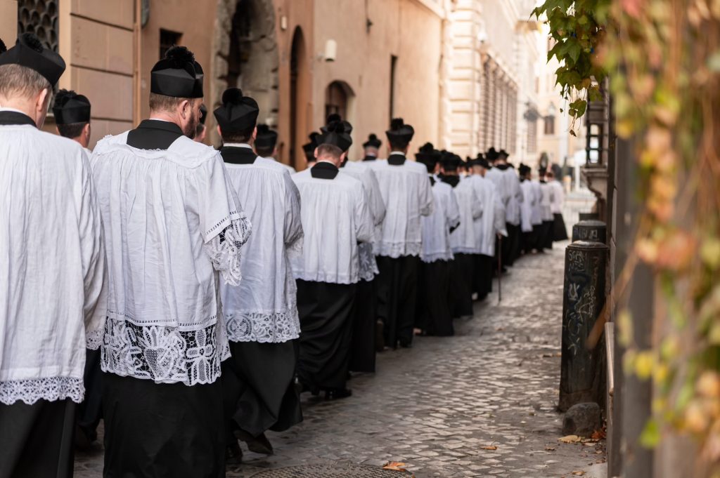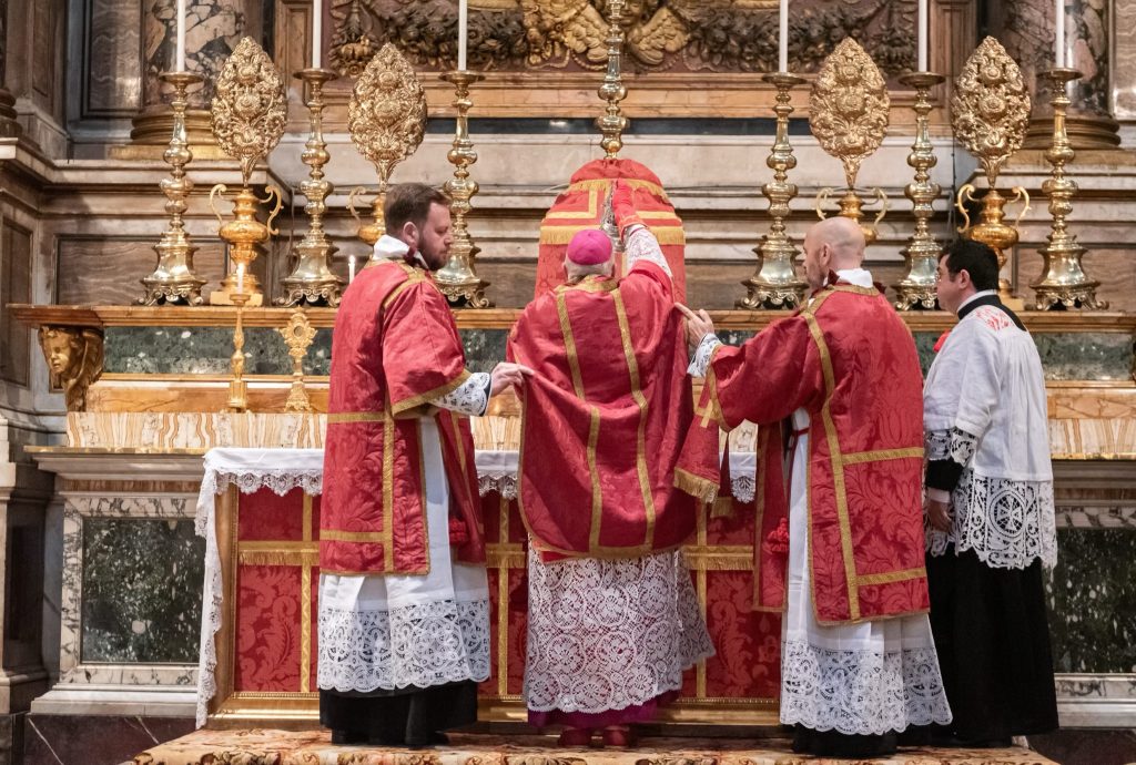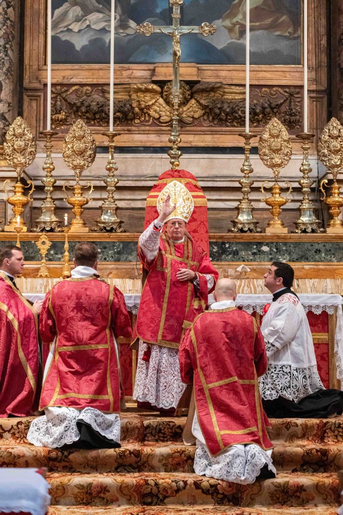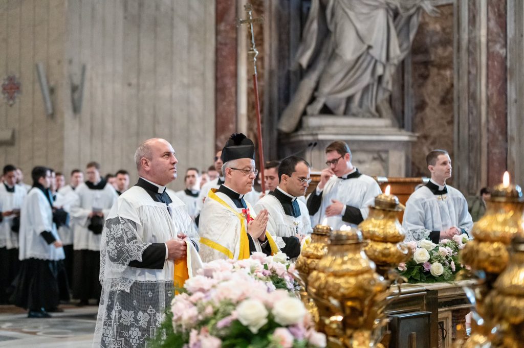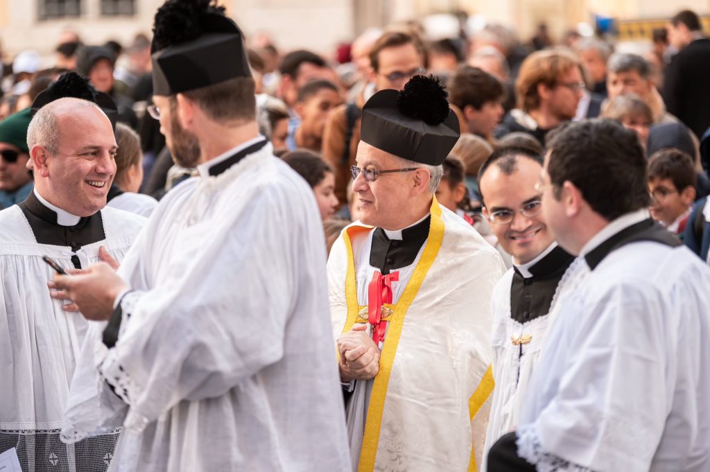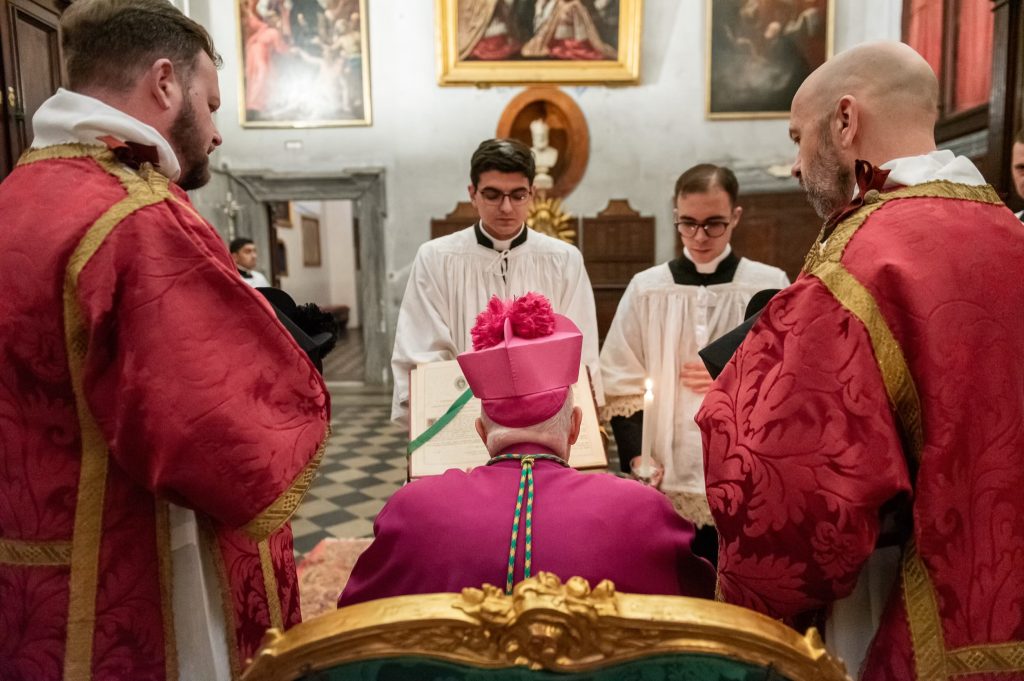 Sabato 13, nella festa di Santa Lucia Vergine e Martire, Sua Eccellenza Reverendissima Mons. Pozzo, Arcivescovo Titolare di Bagnoregio, ha pontificato la Santa Messa al faldistorio presso la Santissima Trinità dei Pellegrini in cui siamo stati accolti amichevolmente dalla Fraternità Sacerdotale San Pietro. In questa occasione, non solo i seminaristi, ma anche diversi sacerdoti si sono prestati al coro eseguendo il gregoriano ma soprattutto le splendide polifonie che fanno ormai parte del ventennale repertorio dell’Istituto. Terminata la Santa Messa ed elevato un Te Deum alla Provvidenza Divina che non cessa di concedere grazie, apostolati e vocazioni alla nostra giovane comunità, il pellegrinaggio si è snodato in processione attraversando solennemente il centro storico grazie alla grande disponibilità delle autorità civili. Sotto gli occhi degli esercenti, dei turisti e dei romani affacciati alle finestre la lunga processione,al canto di inni latini e cantici in differenti lingue nazionali, ha raggiunto dapprima Castel Sant’ Angelo e poi Via della Conciliazione all’inizio della quale ci attendevano i volontari del Giubileo che incaricati dal Dicastero competente hanno operato per un acceso rapido, solenne e devoto in Piazza San Pietro. La processione attraversava dunque la Porta Santa al canto delle litanie dei santi guidata dai superiori maggiori della nostra società di vita apostolica di diritto pontificio. Incredibile ed indescrivibile la gioia e lo stupore dei pellegrini venuti dai continenti più lontani e che vedevano per la prima volta la chiesa simbolo di tutta la cristianità.